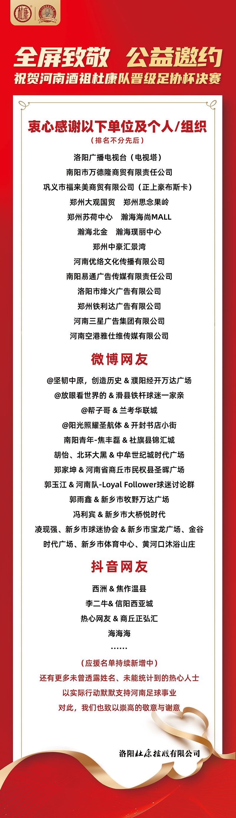 杜康谨以此文,致敬并感谢每一位参与者,感谢你们用行动让河南足球的呐喊声响彻中原!还有更多未曾透露姓名、未能统计到的热心人士,以实际行动默默支持河南足球事业,对此,我们也致以崇高的敬意与谢意!